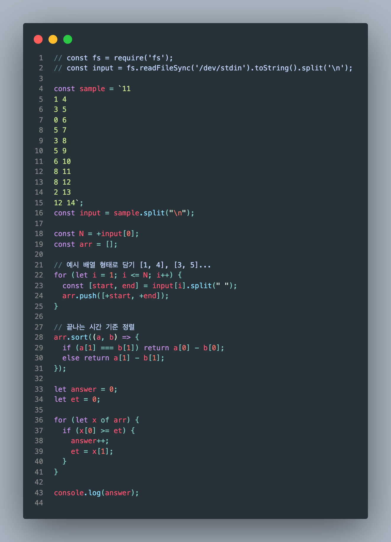 이를 위해 arr를 끝나는 시간 기준으로 정렬해준다.